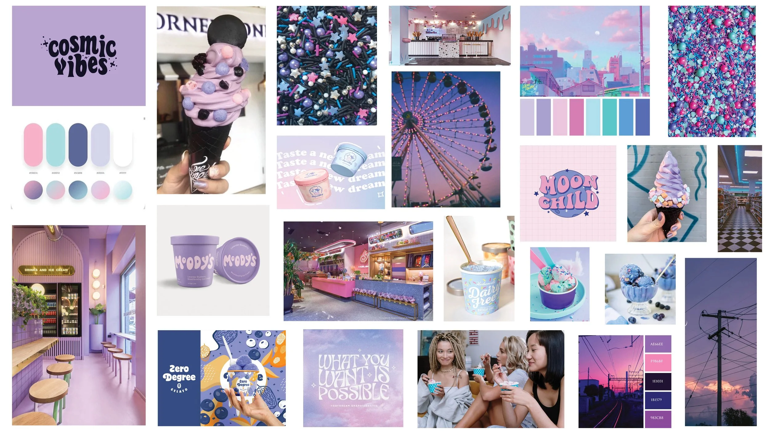 MOONLIGHT CREAMERY is a vegan late-night ice cream brand. It offers a variety of ice cream flavors and toppings, milkshakes, floats, and banana splits. The ice cream shop wanted to create a funky and approachable brand, one that utilizes cool pastels and drippy, playful imagery. The new friendly owl mascot logo evokes images of starry skies and moonlit nights. Overall, we were able to create a colorful brand that could be applied across print and digital.